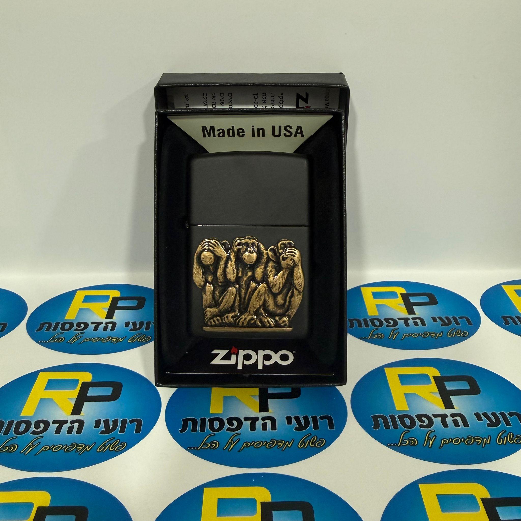 עמוד הביתחריטה על מוצריםחריטה על זיפו מצת זיפו שלושת הקופים תלת מימד